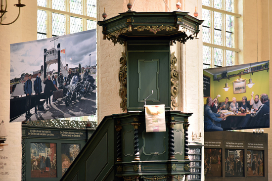 Die ausgewählten Bildtafeln wurden auf Stoff gedruckt und so im Kirchenraum installiert,